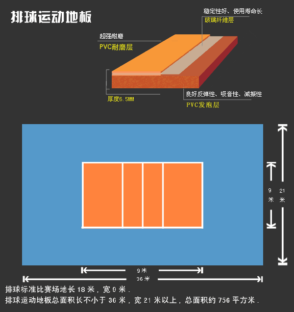 运动PVC是高性价比的综合馆室内PVC运动地板。由多层同质高浓度的聚氯乙烯基材料组成;顶部的耐磨层经独特的聚亚氨脂处理,表面采用防滑压花;中层的聚氯乙烯中添加了特殊的玻璃纤维层,以保障尺寸稳定性;底层采用纯PVC发泡材料做底衬,增加冲击吸收能力和能量返回能力。