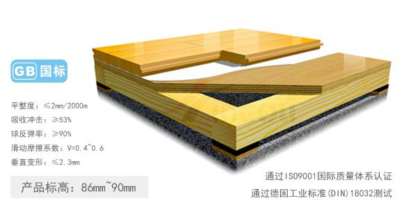 经过DIN认证—产品符合甚至超过DIN1803—2的标准,即球的回弹,震动吸收,垂直变形,滚动荷载,相对垂直变形率W500处变形和表面摩擦系数六项标准。可用于篮球、排球、羽毛球、壁球球、舞蹈健身等不同水平的体育活动。
